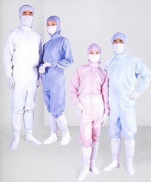 防靜電連體服用不同色的防靜電布制成。布料紗線含一定比例的導(dǎo)電紗,導(dǎo)電紗又是由一定比例的不銹鋼纖維或其它導(dǎo)電纖維與普通纖維混紡而成。通過導(dǎo)電纖維的電暈放電和泄漏作用消除服裝上的靜電。由于不銹鋼纖維屬金屬類纖維,所以,由它織成的防靜電布料的導(dǎo)電性能穩(wěn)定,不隨服裝的洗滌次數(shù)而變化